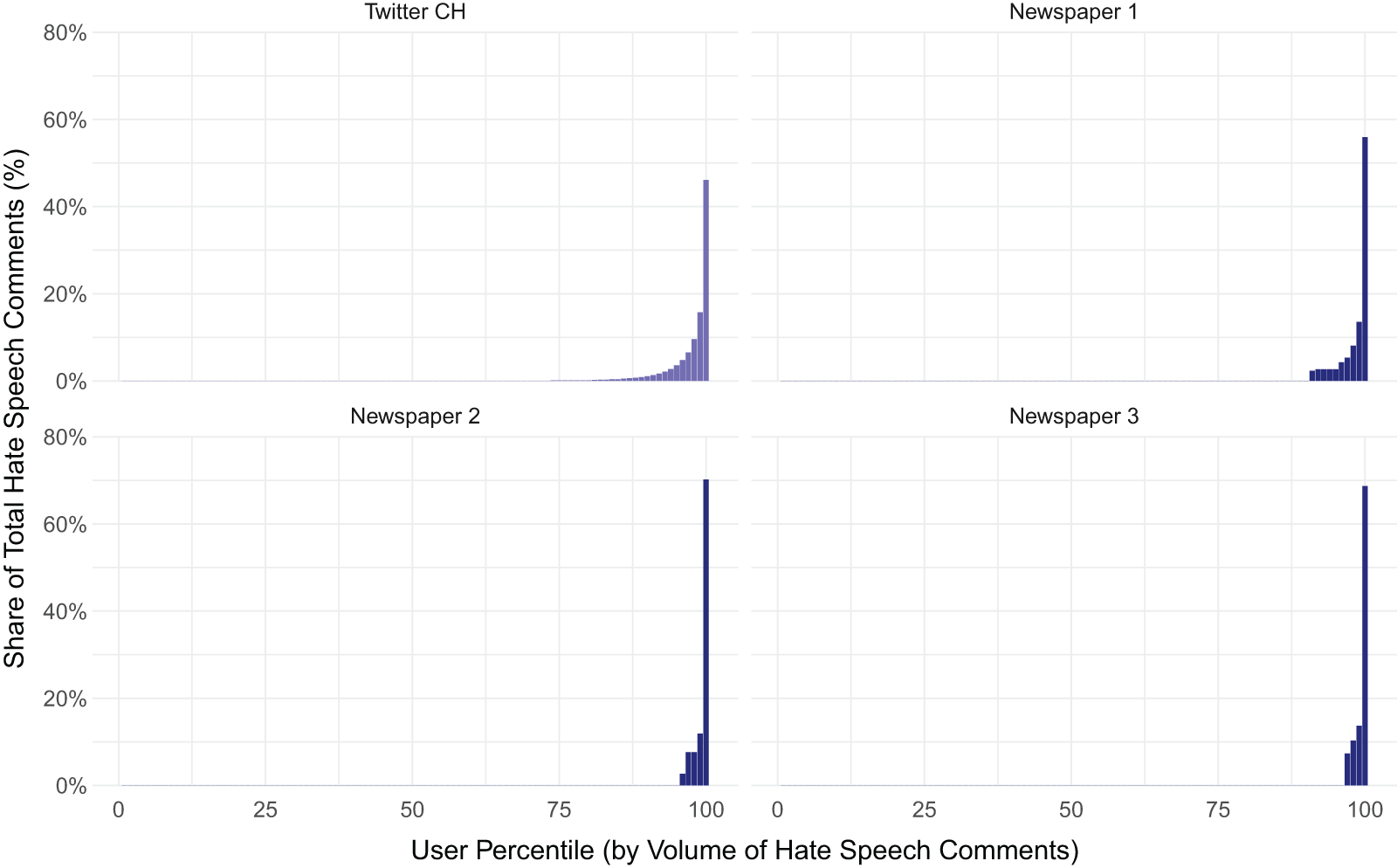 In einer neuen Studie zeigen Forschende der ETH Zürich, der Universität Zürich und dem University College London, dass ein kleiner Teil der User:innen für einen Grossteil der online präsenten Hassrede verantwortlich ist. Dies gilt für verschiedene Länder und Online-Plattformen. Die Studie analysiert Millionen von Kommentaren in Schweizer Online-Nachrichtenmedien sowie Tweets aus der Schweiz und den USA. Sie zeigt, dass Hassrede tendenziell von einer relativ kleinen Gruppe entschlossener User:innen produziert wird – ähnlich wie bei der Verbreitung von Desinformation. Die genauen Zahlen variieren zwar je nach Plattform, aber insgesamt sind 5% der User:innen für 83% bis 100% der Hass-Posts verantwortlich. (Das sehen wir auch am Public Discourse Indicator, der auf aktuelleren Daten einiger der gleichen Schweizer Medienplattformen basiert.)